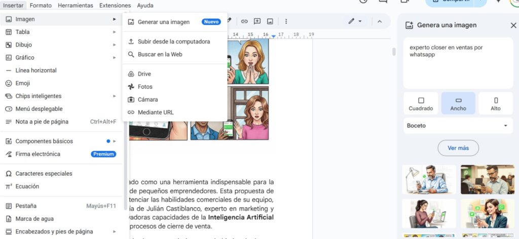 La integración es intuitiva y se adapta al flujo de trabajo natural de Google Docs. Aquí te explicamos los pasos para empezar a generar tus propias imágenes: