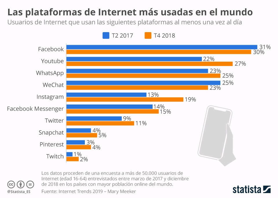 Facebook lidera el listado de plataformas digitales más utilizadas durante 2018. El estudio fue aplicado en los países con mayor población digital a personas entre los 16 y 64 años. Youtube ocupa el segundo lugar, aumentando un 5% frente a 2017 al igual que Instagram, ubicado en el quinto puesto.